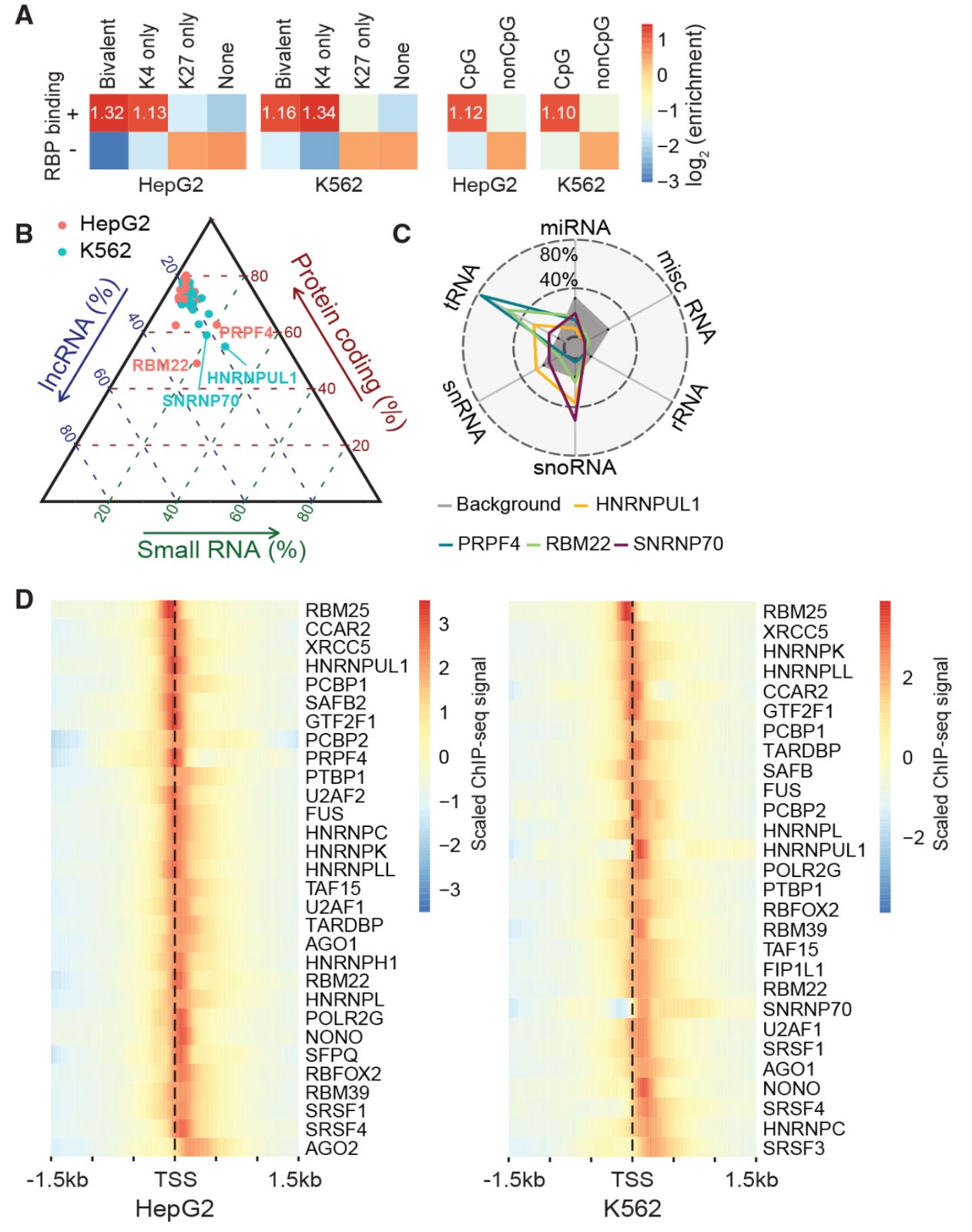 启动子是RBP-染色质相互作用的主要位置,作者进一步研究单个RBP的启动子结合情况。发现RBP共同优先结合用H3K4me3和H3K27me3标记的二价启动子以及单独H3K4me3修饰的活性启动子和CpG,不同的是在HepG2细胞中,二价基因比仅H3K4me3基因更为普遍,在K562细胞中则相反(图2A),这表明染色质相关的RBP可能积极参与细胞类型特异性基因表达程序。关于在不同类别基因的启动子,相对于蛋白质编码和lncRNA基因的启动子,四个RBP(即RBM22,PRPF4,HNRNPUL1和SNRNP70)在小RNA基因的启动子上表现出额外的富集(图2B)。此外,PRPF4在tRNA基因启动子上高度富集,SNRNP70在小核仁RNA(snoRNA)基因启动子上高富集(图2C)。