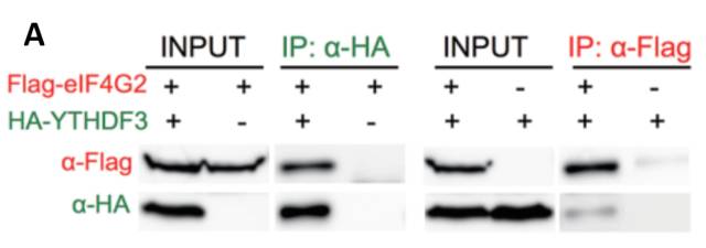 图注:将分别用Flag和HA标记eIF4G2和YTDHF3的表达载体转染细胞后,再分别用Flag和HA标签抗体进行co-IP实验,表明eIF4G2和YTDHF3相互结合。