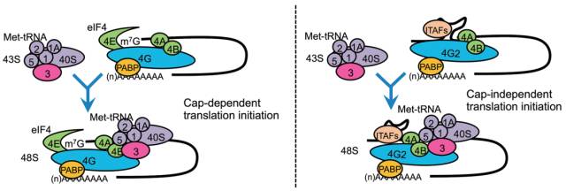 图注:真核细胞中帽子结构依赖性和非帽子结构依赖性的翻译起始的原理图,在帽子结构依赖性翻译中eIF4复合体识别m7G并将43S复合体结合到mRNA中开始翻译;非帽子结构依赖性的翻译中eIF4G2直接与mRNA结合,并将43S复合物结合到mRNA中开始翻译。