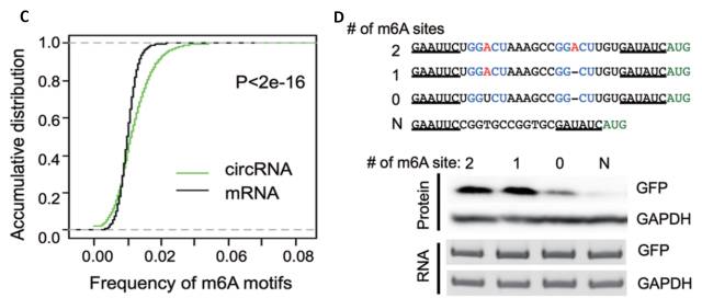 2、circRNA的m6A甲基化水平影响蛋白翻译的效率