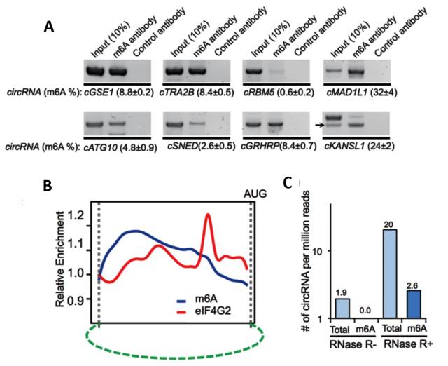 图注:A,用q-pcr检测m6A抗体进行免疫共沉淀的circRNA,表明选取的circRNA具有m6A修饰;B,m6A和eIF4G2结合位点在circRNA上的分布;C,用RNase R处理和不用RNaseR处理的meRIP-seq结果中每百万总reads中所含的circRNA的reads。