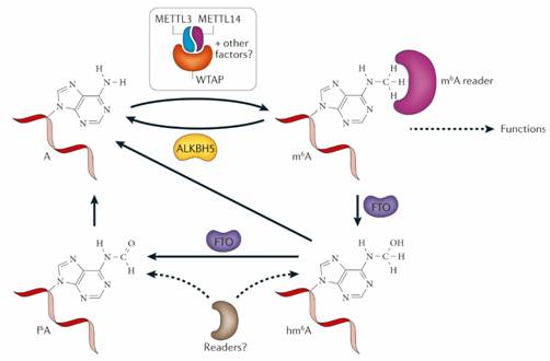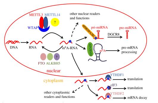 m6A RNA甲基化和去甲基化酶的发现表明m6A修饰是动态和可逆的,这与表观遗传DNA和组蛋白修饰相似。对于m6A组具有生物学功能,则需要通过特定蛋白质的识别来完成。