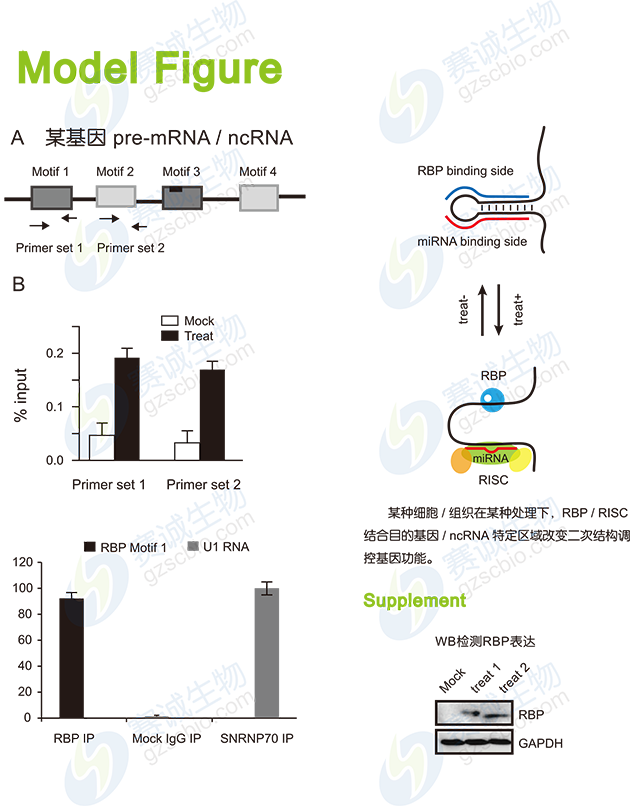 对于一幅RIP-qRT-PCR实验结果Figure,应包含位点作用示意图、qRT-PCR结果数据分析图,并应在Supplement中补充相关的验证性实验图片,具体如下图所示。