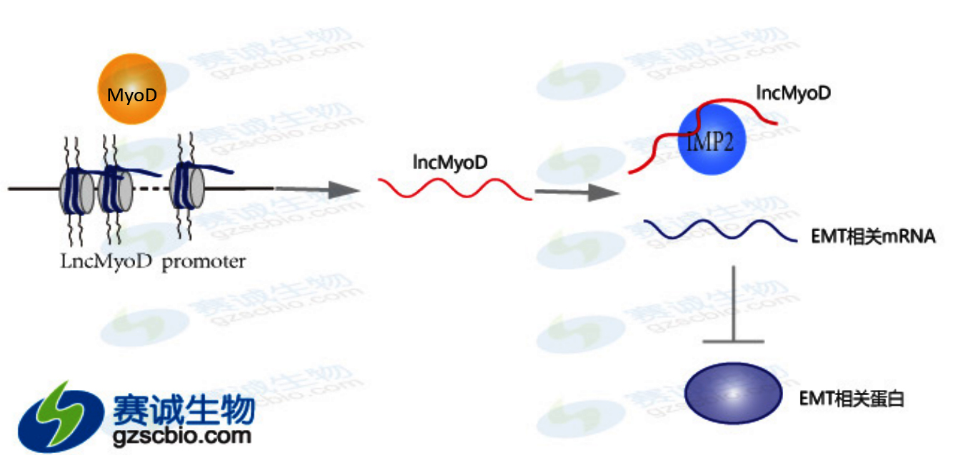 MyoD结合到LncRNA MyoD启动子上促进LncRNA MyoD的表达,然后LncRNA MyoD通过与mRNA结合蛋白IMP2结合,使其不能结合到mRNA上,从而抑制mRNA的翻译。