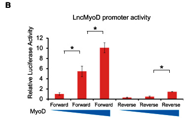 B、通过荧光素酶验证LncMyoD启动子受MyoD的诱导激活下游基因的转录。