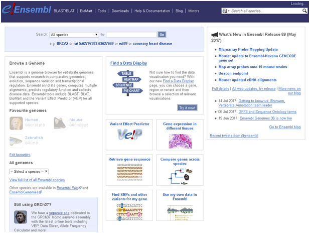 Ensembl is a genome browser for vertebrate genomes that supports research in comparative genomics, evolution, sequence variation and transcriptional regulation. Ensembl annotate genes, computes multiple alignments, predicts regulatory function and collects disease data. Ensembl tools include BLAST, BLAT, BioMart and the Variant Effect Predictor (VEP) for all supported species