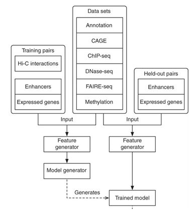 Hi-C,Hi-C的基本流程是首先将染色质,用交联HindIII限制性核酸内切酶将DNA片段切开,形成粘性末端,将带有dCTP-biotion补齐粘性末端,用T4连接酶连接,纯化链接产物,用链霉亲和磁珠捕获带有biotion的DNA互作片段,测序比对DNA互作区域。